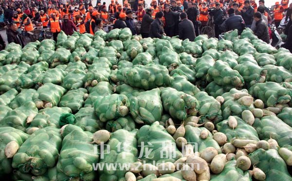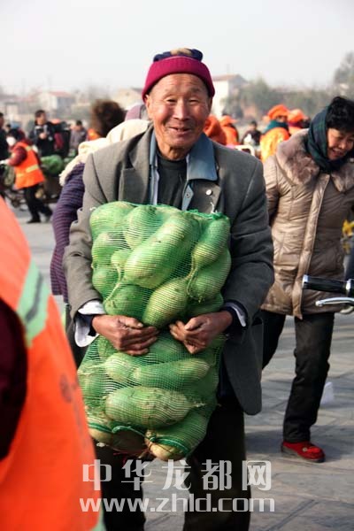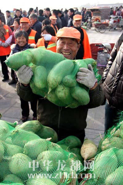 本報(bào)訊 淮陽(yáng)縣劉振屯鄉(xiāng)張老家村千萬(wàn)斤蘿卜滯銷,村民叫苦不迭(見(jiàn)本報(bào)11月19日A05版報(bào)道)。經(jīng)過(guò)本報(bào)和愛(ài)心企業(yè)的多方努力,蘿卜滯銷情況已有所緩解。連日來(lái),本報(bào)聯(lián)合同和堂大藥店開(kāi)展的“愛(ài)心蘿卜”義賣(mài)、贈(zèng)送活動(dòng),已累計(jì)售出蘿卜23萬(wàn)斤。昨天,“愛(ài)心接力”從川匯區(qū)轉(zhuǎn)移至淮陽(yáng)。當(dāng)天,20萬(wàn)斤蘿卜免費(fèi)派送活動(dòng)在淮陽(yáng)縣太昊陵廣場(chǎng)啟動(dòng),1000余戶淮陽(yáng)貧困家庭喜領(lǐng)“愛(ài)心蘿卜”(如圖)。