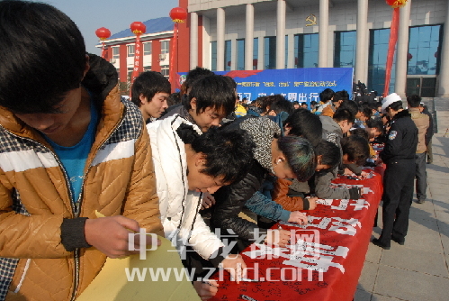 城市管理需全民參與。圖為市民在“文明交通”承諾橫幅上簽名。 晚報記者 彭慧 攝