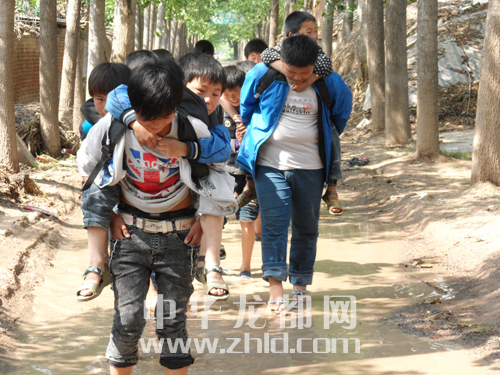 上學(xué)路上有段泥路,每逢下雨時(shí),大孩子幫助小孩子趟水走過????