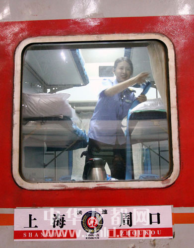 ????在K1505次列車13號車廂,記者見到了這節(jié)車廂的乘務(wù)員張靜逸。乘客一進(jìn)站登車,張靜逸的工作就開始了——為乘客檢票。真正的忙碌是在乘客上車后,張靜逸負(fù)責(zé)12號和13號兩個(gè)臥鋪車廂,每個(gè)車廂核載66人,列車開出后,她要先為乘客一一換票,然后,帶上手套,拿著塑料袋,來回穿梭在列車過道中清理車廂內(nèi)的垃圾。張靜逸一路上都在重復(fù)這些工作。