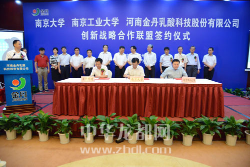 ????本報訊(記者 李莉) 7月9日上午,南京大學(xué)、南京工業(yè)大學(xué)、河南金丹乳酸科技股份有限公司創(chuàng)新戰(zhàn)略合作聯(lián)盟簽約儀式在鄭州舉行。副省長張維寧,中國工程院院士張全興,南京大學(xué)副校長談?wù)苊簦暇┕I(yè)大學(xué)副校長喬旭,省科技廳廳長張震宇,市委書記、市人大常委會主任徐光,省環(huán)保廳副廳長師偉,市委常委、常務(wù)副市長劉保倉,市委常委、組織部長靳磊,副市長王田業(yè),及鄲城縣主要領(lǐng)導(dǎo)、河南金丹乳酸公司主要負(fù)責(zé)人出席簽約儀式。
