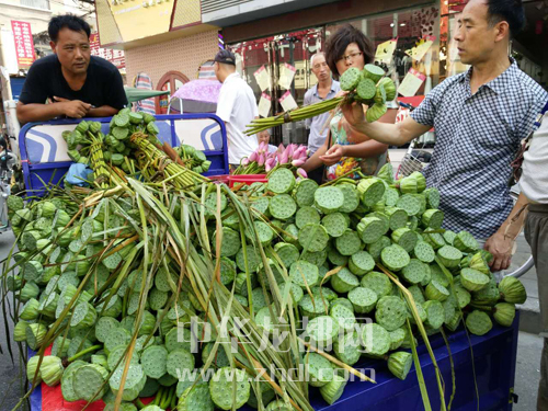 ????7月25日上午,在周口中心城區(qū)六一路上,一些流動(dòng)攤販正在販賣荷花、蓮蓬,縷縷清香沁人心脾,引得不少市民爭(zhēng)相購買。晚報(bào)記者 朱海龍 攝