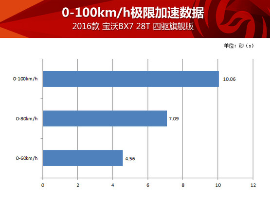 由于有四驅(qū)系統(tǒng)保障,寶沃BX7四驅(qū)版車型在全力加速起步瞬間非常平穩(wěn),6AT變速器換擋還是平穩(wěn)優(yōu)先,所以全力加速時(shí)升檔也沒有太明顯的頓挫、動(dòng)力中斷或者不平順,整個(gè)過程很舒服,而10秒出頭的測(cè)試成績(jī)對(duì)于這臺(tái)2.0T動(dòng)力的中型SUV也很不錯(cuò),請(qǐng)別忘了因?yàn)榕c變速器的匹配,這臺(tái)2.0T發(fā)動(dòng)機(jī)的扭矩被限制在300牛頓·米,也就是說這臺(tái)“高功率”發(fā)動(dòng)機(jī)其實(shí)并沒使出全力,我們完全有理由相信解除封印后它理應(yīng)跑得更快。