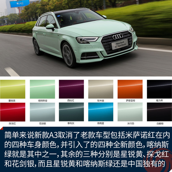 先來說說喀納斯綠到底是什么顏色吧。簡(jiǎn)單來說新款A(yù)3取消了老款車型包括米薩諾紅在內(nèi)的四種車身顏色,并引入了的四種全新顏色,喀納斯綠就是其中之一,其余的三種分別是星銳黃、探戈紅和花劍銀,而且星銳黃和喀納斯綠還是兩種中國(guó)市場(chǎng)獨(dú)有的顏色。如果說這個(gè)顏色看上去像什么,我覺得大概像是哈密瓜冰激凌,或者是綠色的奶油,反正給我一種清新又甜蜜的錯(cuò)覺。