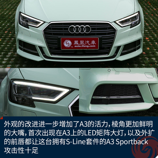 新顏色的加入讓原本青春靚麗的A3變得更加鮮嫩,雖說這樣的顏色不一定適合所有人,但是至少我是很喜歡的,應(yīng)該不少女生也會(huì)心生好感。而外觀的改進(jìn)進(jìn)一步增加了A3的活力,棱角更加鮮明的大嘴,首次出現(xiàn)在A3上的LED矩陣大燈,以及外擴(kuò)的前唇都讓這臺(tái)擁有S-Line套件的A3 Sportback攻擊性十足,同時(shí)全系都將標(biāo)配氙氣大燈也是誠(chéng)意滿滿。而高配置的A3 Limousine會(huì)在中網(wǎng)多一些鍍鉻裝飾來凸顯質(zhì)感,當(dāng)然前唇的造型也會(huì)收斂許多。