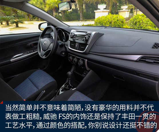 當(dāng)然簡單并不意味著簡陋,沒有豪華的用料并不代表做工粗糙,威馳 FS的內(nèi)飾還是保持了豐田一貫的工藝水平,并且通過黑色與銀色相互的搭配,你別說,這個(gè)內(nèi)飾的設(shè)計(jì)還挺不錯(cuò)的。