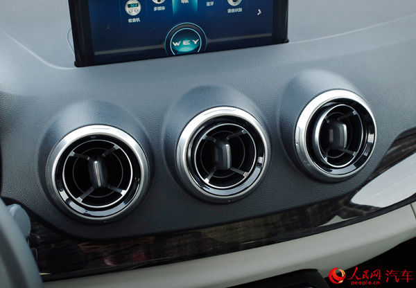 坐進車內(nèi),或許能更直觀地感受到長城為WEY品牌的首款車型所營造的豪華氛圍。或許“豪華”二字并不是最準(zhǔn)確的形容詞,因為VV7的內(nèi)飾設(shè)計更多地傳遞了一種科技感。大傾斜角度的中控臺上,有著寬大的飾板區(qū)分上下兩層,圓形的空調(diào)出風(fēng)口設(shè)計巧妙且有型,給你不錯的印象。