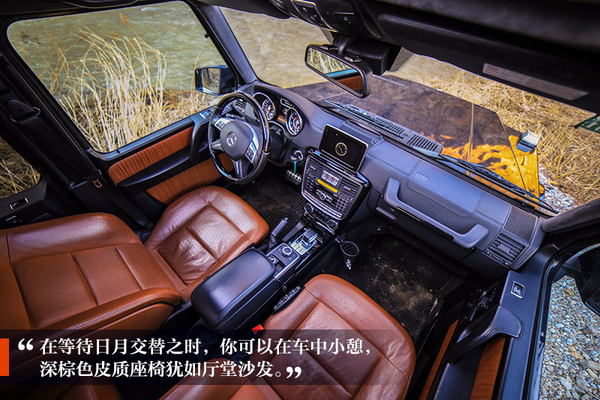 在等待日月交替之時(shí),你可以在車中小憩,方殼子造型的車體,像是一個(gè)移動(dòng)的居所,G 63 AMG中的深棕色皮質(zhì)座椅,就好似廳堂中的沙發(fā),供人高談、辨析、訴情、吹煙。中控九宮格數(shù)字“點(diǎn)唱機(jī)”,不再選擇聒噪的887,而是從中播出歲月的聲音,流出時(shí)間的經(jīng)典,隨著天色變暗,內(nèi)心也趨于平靜。