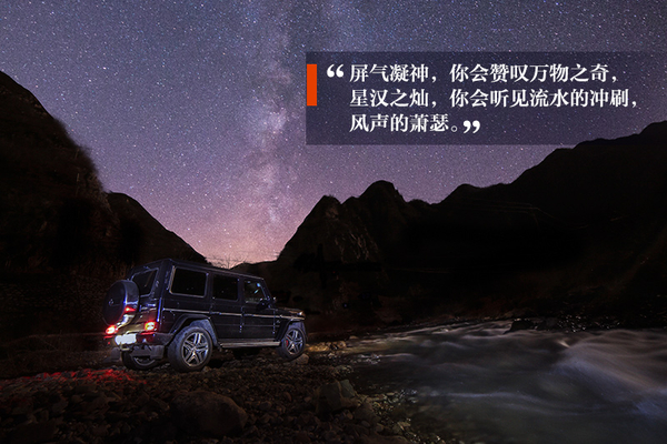 墨分五色,暗與黑之間也相隔甚遠(yuǎn),但你正可以在此時(shí),借助月光,找到一個(gè)好的觀測(cè)和拍攝角度。車這個(gè)伙伴,也在前照燈的照明下,趟過流水,踏上卵石,陪你一起等待即將而來的精彩。