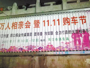 ????據(jù)了解,周口萬人相親會是由市委組織部青年工作辦公室、共青團(tuán)周口市委、市婦聯(lián)、周口報(bào)業(yè)傳媒集團(tuán)聯(lián)合主辦的大型相親平臺。為再一次給廣大消費(fèi)者搭建更好的選車、購車平臺,周口報(bào)業(yè)傳媒集團(tuán)決定于11月10日至12日在市體育場隆重舉辦2017周口萬人相親會暨“雙十一”購車節(jié)。