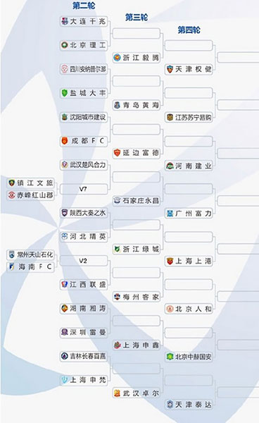 第四輪開始16支中超球隊加入角逐,加上從第三輪晉級的16支球隊,共32支球隊參賽,中超球隊自動落位相應客場簽位,其中廣州恒大、上海申花、上海上港和天津權健4支亞冠球隊將分別落位在A、B、C、D區(qū),這4支球隊在半決賽之前不會相遇。