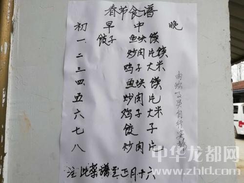 午飯時(shí),老人們井然有序地端著饅頭、大米粥、小酥肉等在餐廳內(nèi)就餐。兩個(gè)剛吃過飯的老人仔細(xì)查看貼在食堂門口的《春節(jié)食譜》,路過的一位老太太開玩笑說他們吃著碗里看著鍋里。李學(xué)告訴記者:“從正月初一到正月十五,敬老院的菜譜葷素搭配,每日三餐不重樣。5名炊事員一門心思想讓老人吃得香、吃得鮮、吃得好?!蓖瑫r(shí),記者發(fā)現(xiàn)在敬老院的前排房間前,兩名服務(wù)員正推著餐車一間挨著一間為行動(dòng)不便的老人們送水、送飯。
