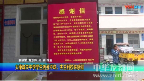 中華龍都網訊(周口報業(yè)全媒體記者 馬治衛(wèi) 通訊員 王宇先)3月15日,市民劉永坤帶著寫有“拾金不昧 品德高尚”的錦旗送到太康縣四中,對該校學生袁偉強的拾金不昧行為表示謝意。