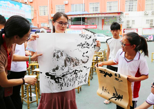 中華龍都網(wǎng)訊(周口報(bào)業(yè)全媒體記者 李瑞才 通訊員 孫廣合 胡洪濤)6月26日上午,鹿邑縣政協(xié)和縣文聯(lián)聯(lián)合開展“到人民中去”送書畫進(jìn)校園活動(dòng),組織10余位知名書畫家走進(jìn)校園,現(xiàn)場揮毫潑墨,為師生義寫字畫。