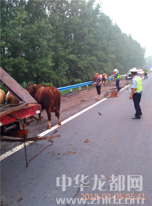 中華龍都網(wǎng)訊(周口報(bào)業(yè)全媒體記者 姬慧洋 通訊員 劉杰 文/圖)“在大廣高速2025公里西半幅附近發(fā)生一起單方事故,幾十頭牛散落在路面,請(qǐng)求處警。”7月5日5時(shí)許,周口市公安局交通管理支隊(duì)高速二大隊(duì)扶溝中隊(duì)接到110指令稱。