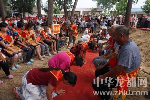 儀式上宣布了對前何行政村31戶孝老愛親之家進行表彰的決定,并為他們頒發(fā)了“馬廠鎮(zhèn)孝老愛親之家”牌匾。在《愛的奉獻》樂曲伴奏下,31個孝老愛親之家的孝順兒子、孝順兒媳婦向自己的父母行跪拜之禮。