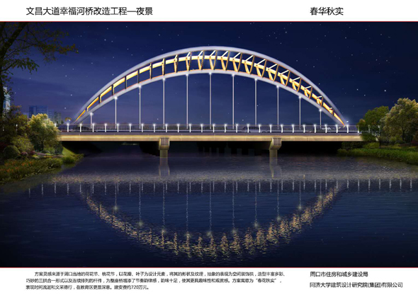 周口大道沙潁河橋景觀改造,設(shè)計(jì)造型簡單柔美,如行云流水,同時(shí)與沙潁河景觀帶相融合,給城市增添了生機(jī)與活力。周口大道賈東干渠橋以荷葉為設(shè)計(jì)元素,造型簡約而不失細(xì)節(jié)。周口大道流沙河橋造型簡潔大氣,線條流暢,像一條青龍游弋在水面上。文昌大道幸福河橋以花瓣、葉子為設(shè)計(jì)元素,造型豐富多彩。文昌大道流沙河故道橋在中分帶位置修建花壇,花壇造型莊重古樸,景石造型端莊沉穩(wěn)。太清路流沙河橋以古建斗拱、窗花為元素,造型儒雅大方。太清路洼沖溝2號橋以“輻轂相依”為名,既融合環(huán)境,又有團(tuán)結(jié)、合作的寓意。太清路賈魯河橋,增加了景觀造型,使人們可以重溫當(dāng)年賈魯河的美好畫卷。彭新莊橋以柳葉為元素,預(yù)示著留住賓客與送別親友的不舍之情的雙重含義。
