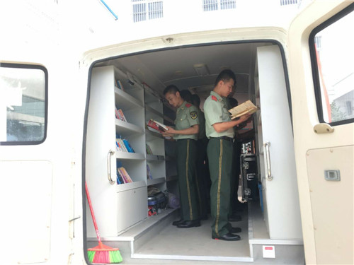 文化擁軍是商水縣圖書館的優(yōu)良傳統(tǒng)。當天,流動圖書車一來到縣武警中隊駐地,士兵們便不約而同圍了過來,有的走上圖書車尋找喜愛的圖書,有的則直接坐在車上,認真翻閱書籍。戰(zhàn)士小劉表示:“我最喜歡人物傳記方面的圖書,今天他們送來了許多。我要充分利用這些圖書,讀好書、立好志、當好兵,為實現(xiàn)中國夢、強軍夢和祖國的國防建設作出應有貢獻。”