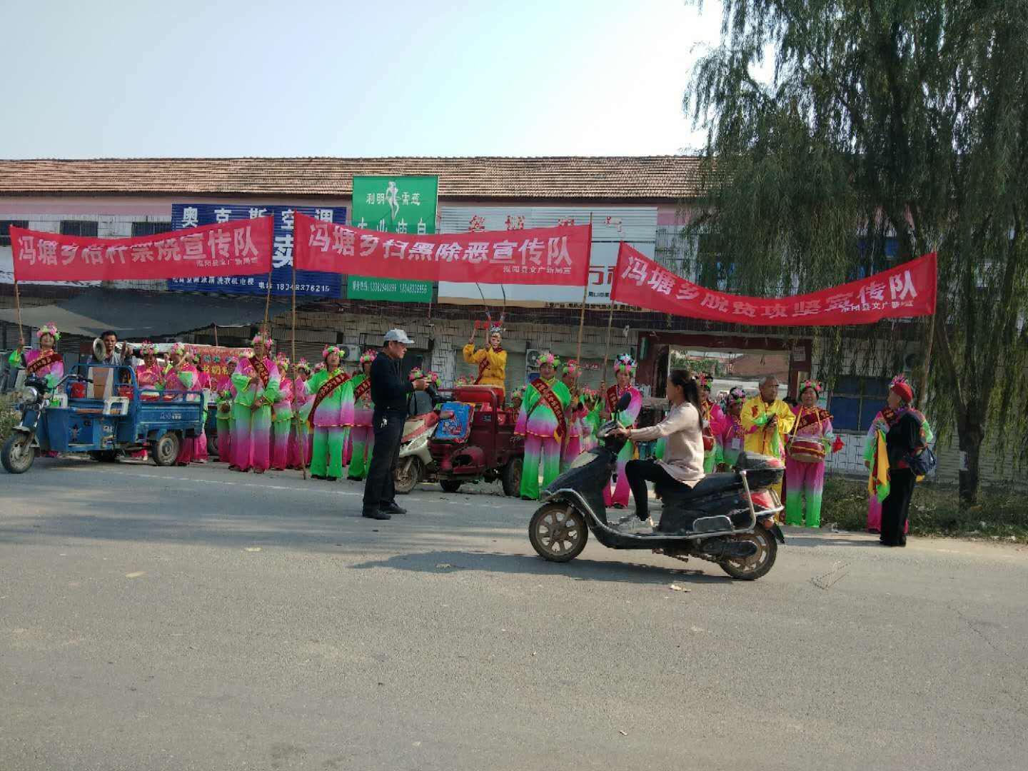 馮塘鄉(xiāng)脫貧攻堅、秸稈禁燒、掃黑除惡三支宣傳隊進行宣傳。