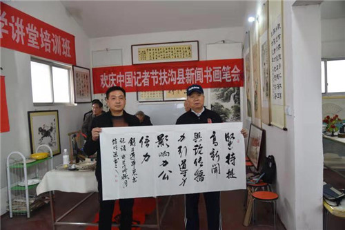 筆墨寫春秋,重彩頌佳節(jié)。為慶祝第19個(gè)中國(guó)記者節(jié),在扶溝縣的張坡詩(shī)詞名人書畫館,來(lái)自省書法家協(xié)會(huì)的書法家與當(dāng)?shù)匦侣勑麄鞑块T的書畫愛好者們齊聚一堂,以舉行書畫筆會(huì)的形式向新聞媒體人慶賀節(jié)日。