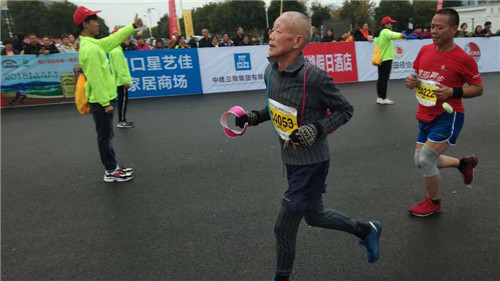 當(dāng)日上午10時(shí)許,孔祥義老人堅(jiān)持跑完了半程馬拉松21.0975公里的路程,臉上露出滿意的笑容。