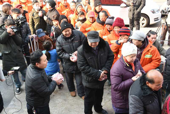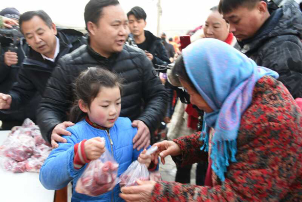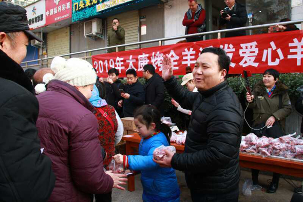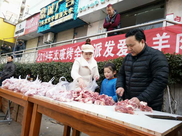 小小燒烤店門前,成了倡導(dǎo)“愛與奉獻(xiàn)主會(huì)場(chǎng)”。 2019年1月1日上午10點(diǎn),新年第一天,鄭州市國基路與豐慶路交叉口太康烤全羊店門口,60多名環(huán)衛(wèi)工、殘疾人、困難群眾等弱勢(shì)群體聚集在這里,排隊(duì)免費(fèi)領(lǐng)取“羊肉哥”孫合理和妻子劉曉愛派送的一份新年禮物——愛心羊肉,而這愛舉從2010年元旦開始到如今,已經(jīng)堅(jiān)持了9年。