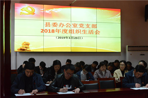 3月29日下午,鹿邑縣委辦公室黨支部召開(kāi)2018年度組織生活會(huì)并開(kāi)展民主評(píng)議黨員活動(dòng)。縣委書(shū)記梁建松,縣委常委、辦公室主任宋濤以一名普通黨員身份參加會(huì)議??h委辦公室機(jī)關(guān)全體同志參加會(huì)議。