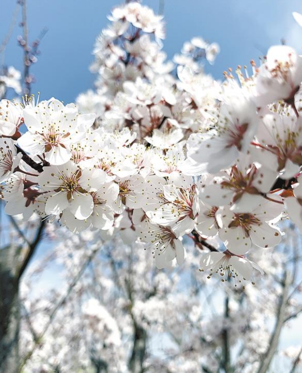 “一葉春風(fēng)吹動(dòng)蕾,紅葉李花妍漫天?!奔t葉李又名紫葉李,屬薔薇科。走近觀看,細(xì)細(xì)密密的粉白色繁花開(kāi)滿(mǎn)枝頭,在紫色葉子的襯托下,顯得別致、靚麗。遠(yuǎn)遠(yuǎn)望去,像是爛漫層疊的櫻花,又宛如飄落大地的云霞,為春天平添幾分嫵媚、幾分浪漫。