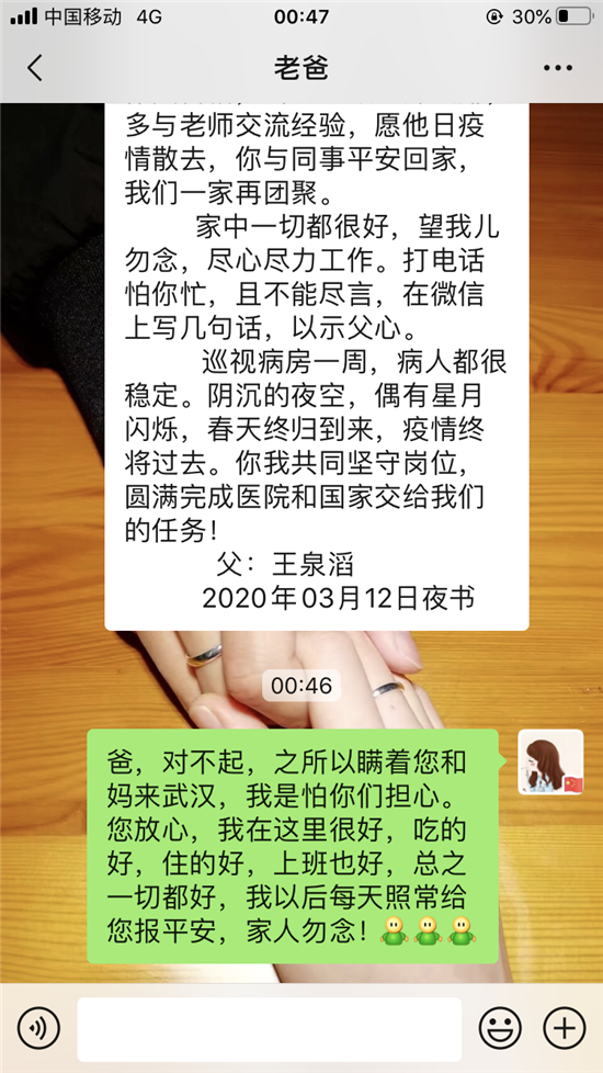 3月13日0時(shí)許交完班的王孟杰看到這封家書(shū)后,淚如雨下。平復(fù)心情后的她給父親回了這么一段話:“爸,對(duì)不起,之所以瞞著您和媽來(lái)武漢,是怕你們擔(dān)心。您放心,我在這里很好,吃得好、住得好,上班也好,總之一切都好。我以后每天照常給您報(bào)平安,家人勿念?!?/p>