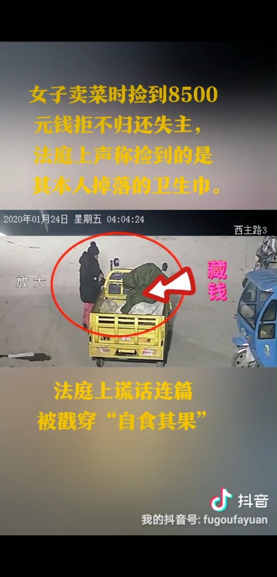 面對證據(jù),楊某見難以掩蓋事實(shí),隨即改口稱是撿到錢了,但只撿到1000元錢。法官將監(jiān)控錄像放大,告知楊某1000元錢的厚度和其撿到的包裹大小明顯不符,希望其如實(shí)陳述。楊某見再也無法抵賴,最終承認(rèn)其撿到8500元錢款的事實(shí)。在法官的當(dāng)庭教育引導(dǎo)下,楊某表示認(rèn)識到了自己的錯(cuò)誤,向原告陳某賠禮道歉,并將撿到的8500元錢款和本案訴訟費(fèi)等各項(xiàng)費(fèi)用共10000元交付陳某。