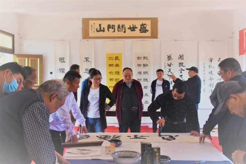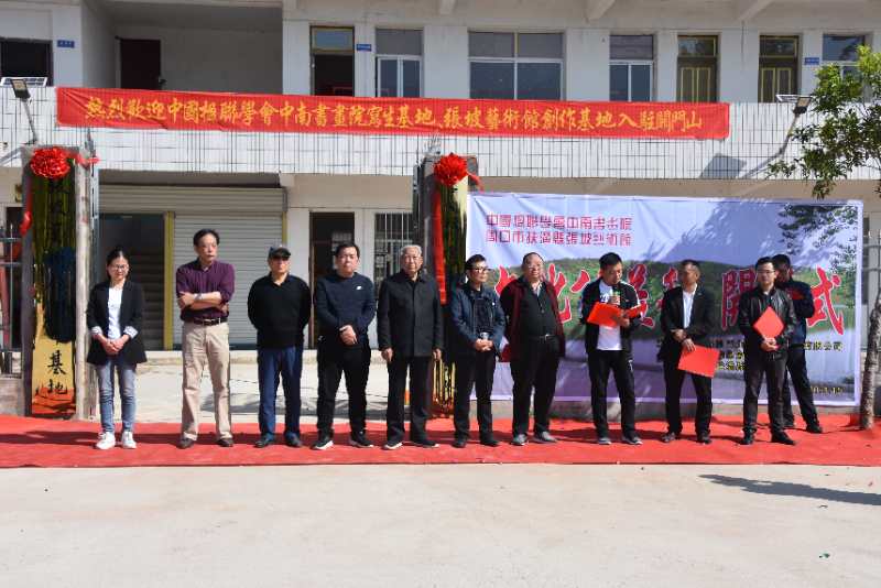路晉成、張俊鵬、高麗、張紅先現(xiàn)場為中南書畫院關(guān)門山寫生基地、張坡藝術(shù)館關(guān)門山創(chuàng)作基地揭牌。書畫家們還現(xiàn)場揮毫潑墨,為村文化中心即興創(chuàng)作了書畫作品,并給當(dāng)?shù)鼐栀浟巳喾鶗嬅壹炎鳌?/p>