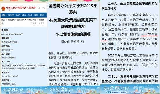 5月8日,中華人民共和國中央人民政府門戶網(wǎng)站發(fā)布《國務院辦公廳關于對2019年落實有關重大政策措施真抓實干成效明顯地方予以督查激勵的通報》國辦發(fā)〔2020〕9號文件,對213個地方予以督查激勵,相應采取30項獎勵支持措施。其中,鄲城縣榮登“對公立醫(yī)院綜合改革成效較為明顯的地方”名錄,獲獎500萬元。