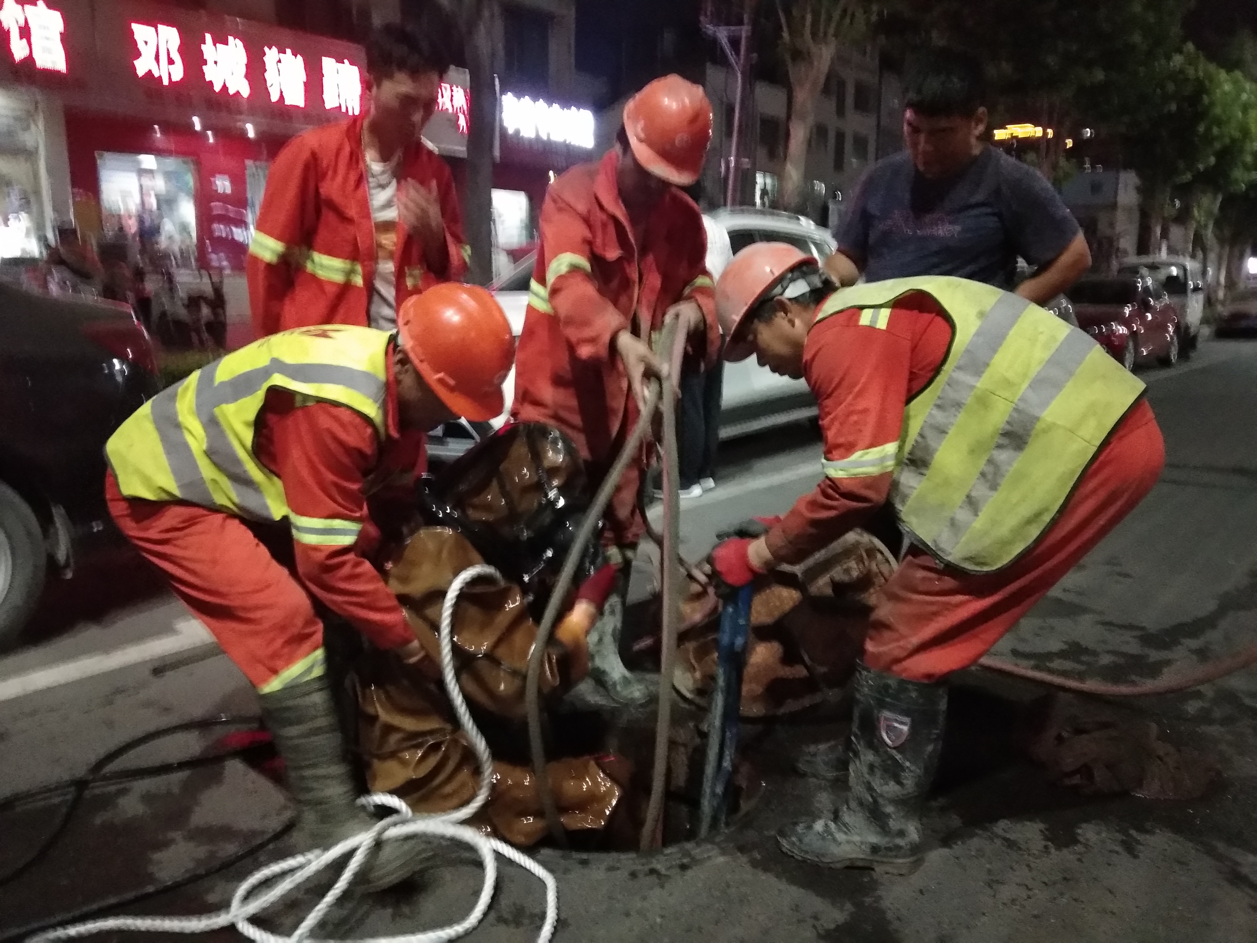 5月31日晚,在周口中心城區(qū)大慶路南段,一名穿著潛水衣的潛水員(又稱“蛙人”),在現(xiàn)場工作人員的幫助下,進入狹小的窨井內(nèi)清理積物。汛期將至,工作人員正加班加點清理城市窨井,疏通城市“經(jīng)絡(luò)”,做到未雨綢繆。