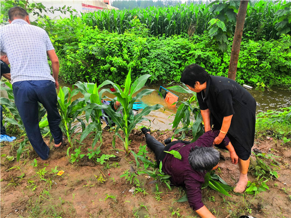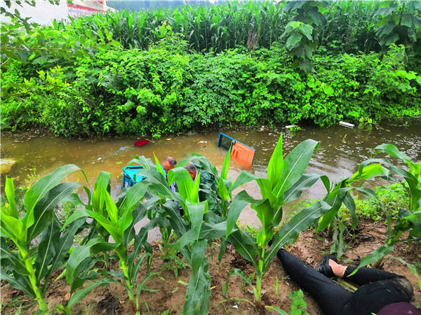 7月26日,連續(xù)多日的降雨已導(dǎo)致農(nóng)村坑滿河平、積水頗深。當(dāng)日下午4時,依然時雷聲陣陣、雨如豆粒,二人在宜路鎮(zhèn)張寨村小學(xué)附近的玉米田間拍照核查“圖斑”時,看到一輛車箱內(nèi)載有幾位老人的電動三輪車冒雨從路邊疾駛過去。緊接著聽到“撲通”一聲,趙文波、李偉二人立即意識到是三輪車掉進(jìn)路溝、落水了。