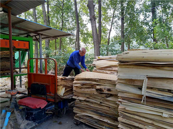 8月28日,商水縣練集鎮(zhèn)馬莊村的四紅木業(yè)有限公司板材加工車間內(nèi),機器轟鳴,工人忙著斷木、打圓、卷板,一張張板材被切割后,拉到曬板場晾曬?!坝辛诉@份收入,去年全家脫貧摘帽?!闭谲囬g里搬運板材的馬莊村貧困戶王天林對記者說。