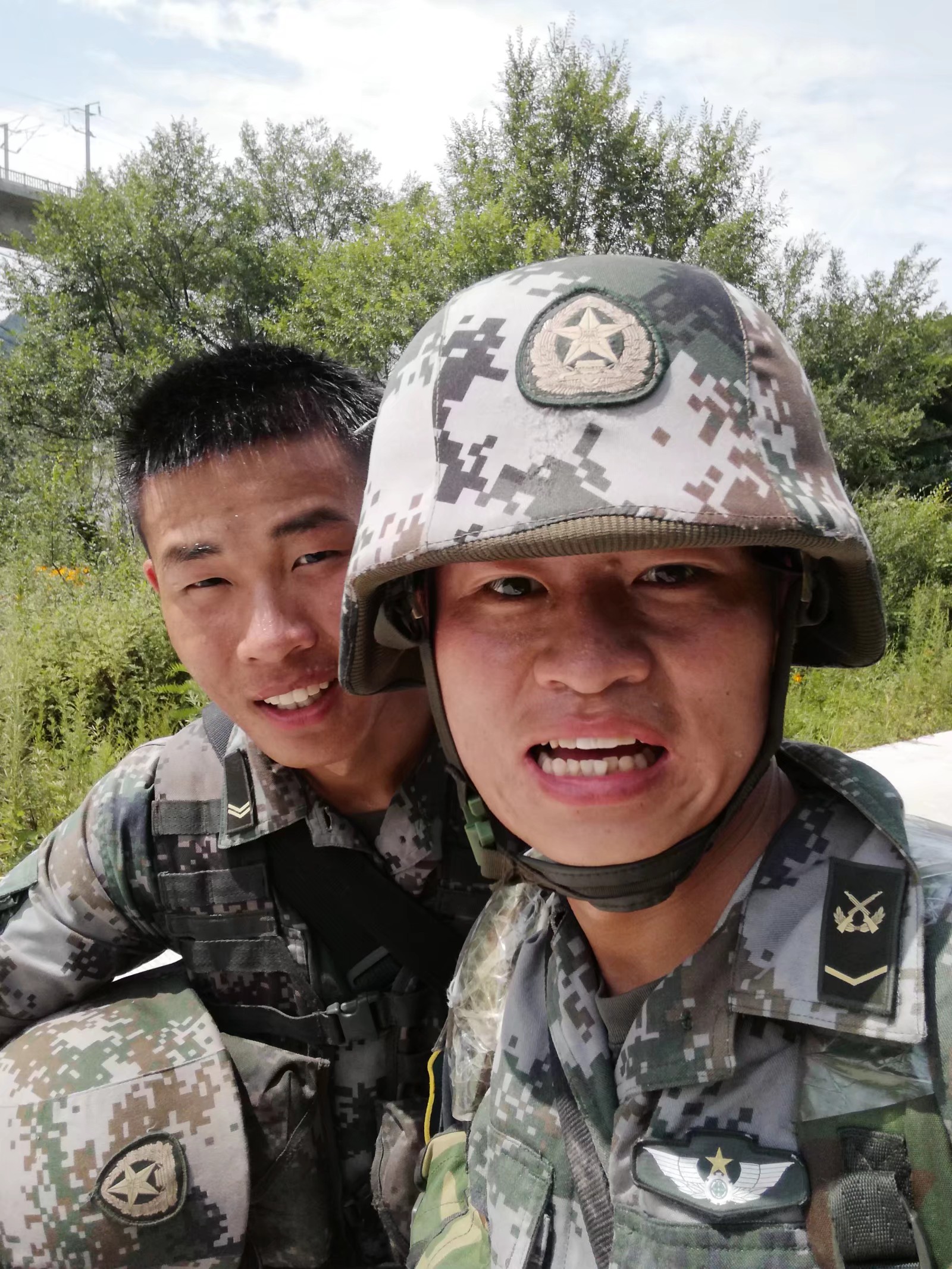 蛙跳、鴨子步、俯臥撐、側(cè)身敬禮、蹲起……盡管汗流浹背,兩位“老兵”在新兵面前沒有一絲疲倦,充分展現(xiàn)了軍人的風(fēng)采,也流露出了兩位青年向往軍營的堅定意志。