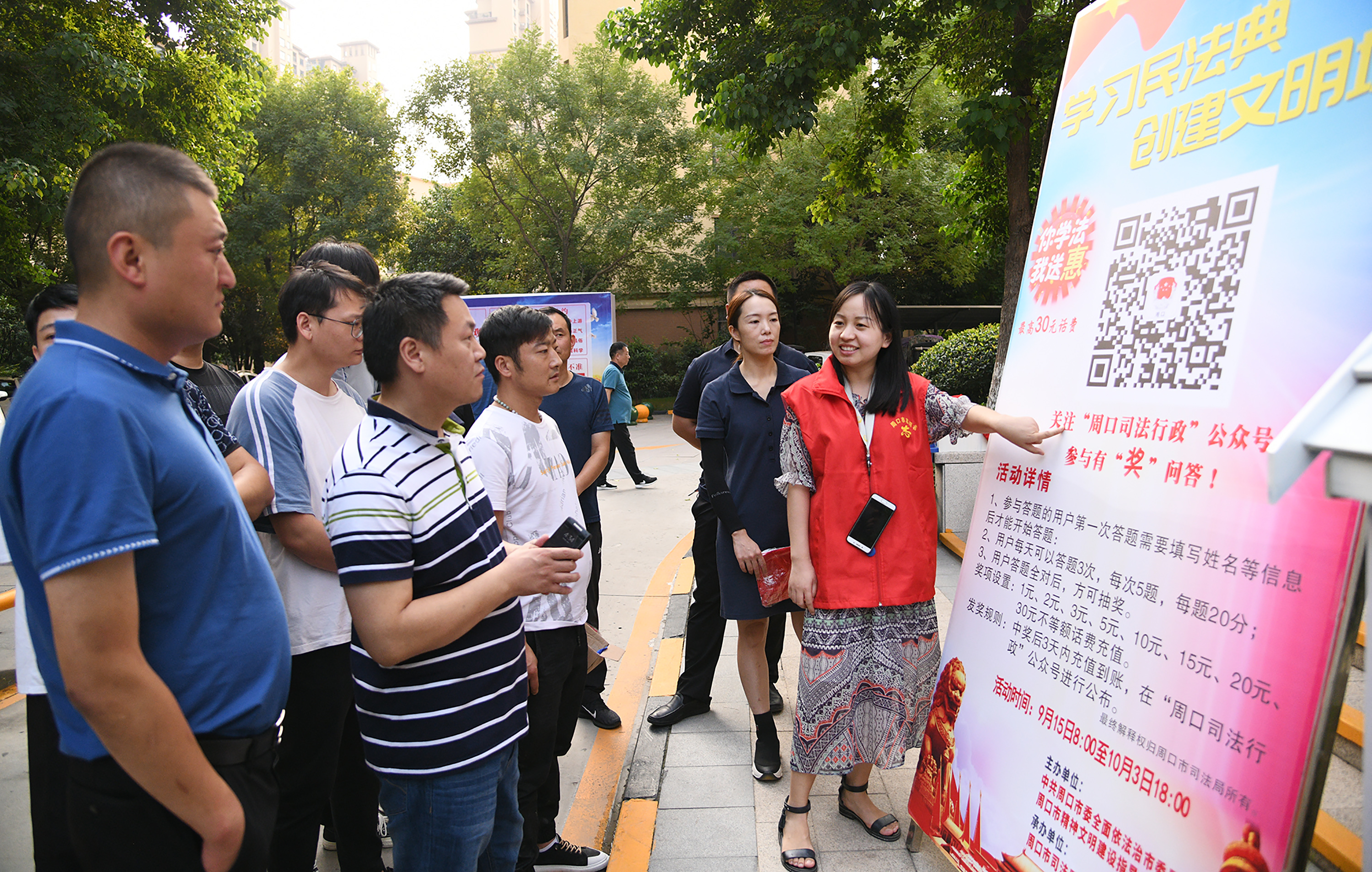 周口日?qǐng)?bào)·新周口客戶端 我國(guó)于今年5月份頒布的《民法典》是一部被譽(yù)為“社會(huì)生活的百科全書”的法律,涉及民生諸多方面。近日,市司法部門深入社區(qū),以學(xué)法有獎(jiǎng)形式,宣傳這部和老百姓生活密切相關(guān)的法律。圖為市司法部門工作人員在建業(yè)森林半島社區(qū)宣傳。記者 梁照曾 攝