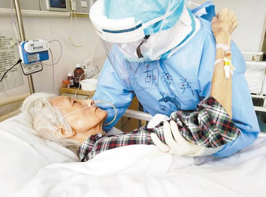 在武漢醫(yī)院,今年84歲的楊守振不僅感染新冠肺炎,而且有嚴(yán)重的營養(yǎng)不良,插著胃管,身體極為消瘦,生活不能自理。為了不讓老人出現(xiàn)壓瘡,胡奔奔需要每隔一個小時為老人翻一次身。翻身時候,為了讓老人更舒服一點,她每次都像抱孩子一樣把老人抱在懷里,動作輕柔地按摩老人受壓的部位,防止壓瘡的形成。