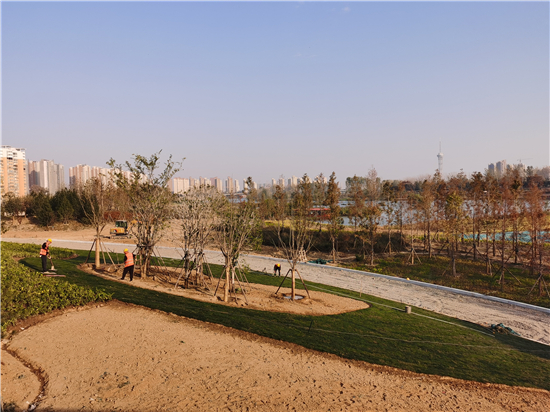 11月11日,在中心城區(qū)沙潁河北岸周口大道至八一大道段生態(tài)改造工程EPC項(xiàng)目施工現(xiàn)場,施工人員正在進(jìn)行地被植物的種植、綠化樹木的養(yǎng)護(hù)。