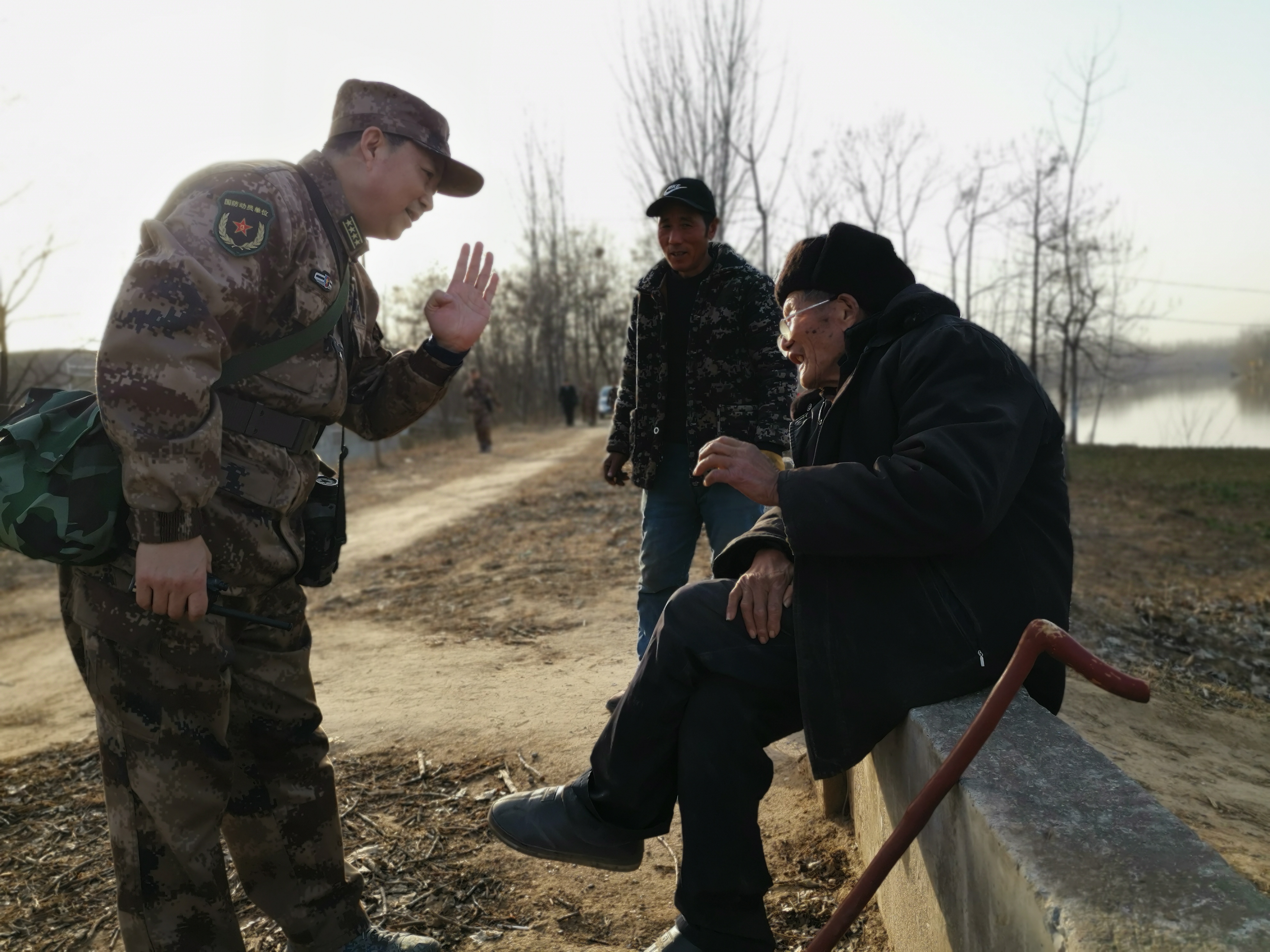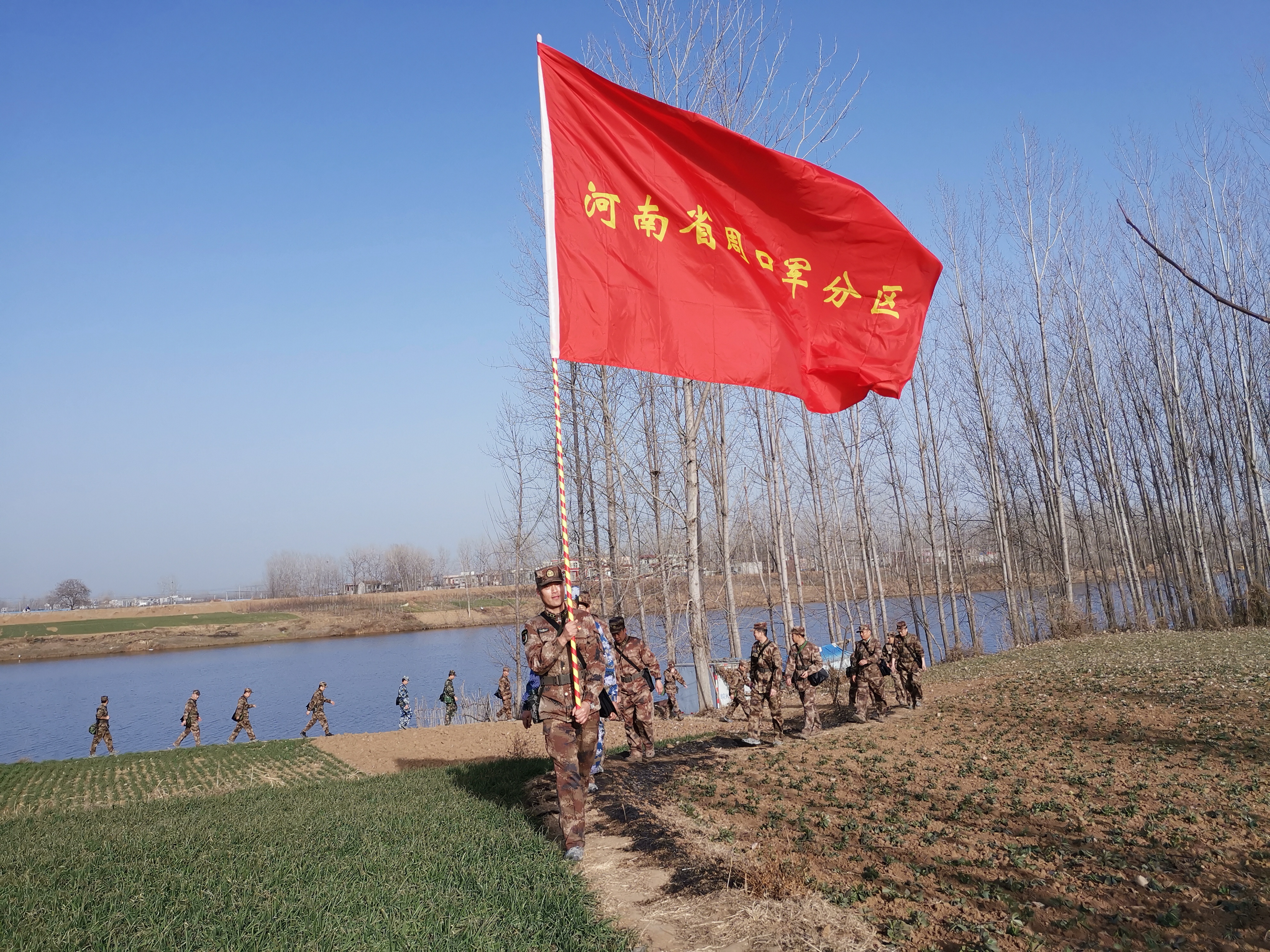 冬日暖陽里,沙潁河畔,一群迷彩身影行走在蜿蜒曲折的沙河堤上。陽光下,“河南省周口軍分區(qū)”的旗幟迎風(fēng)飄揚。