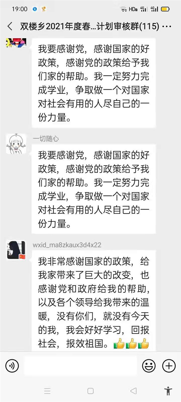 “感謝幫助過我家的所有幫扶人,沒有你們,就沒有我家今天的幸福生活,我們光榮脫貧了,作為貧困家庭中新成長(zhǎng)勞動(dòng)力,我一定珍惜這次來之不易的學(xué)習(xí)機(jī)會(huì),好好學(xué)習(xí)技術(shù),畢業(yè)后回村成為一名技術(shù)帶頭人,來促進(jìn)家鄉(xiāng)產(chǎn)業(yè)的發(fā)展?!编惓强h雙樓鄉(xiāng)孫莊村脫貧學(xué)生張素華在微信群里說。近幾天,鄲城縣雙樓鄉(xiāng)114人的大學(xué)生微信群里可熱鬧了,在鄉(xiāng)黨委政府的引導(dǎo)下,該鄉(xiāng)眾多脫貧后的大學(xué)生通過鄉(xiāng)里建起的微信群,紛紛圍繞“話脫貧、感黨恩、奮進(jìn)新時(shí)代”這一主題交流思想,提振斗志。