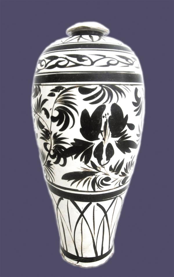 磁州窯,在今河北省磁縣,因其古屬磁州而得名,影響范圍較廣,北方各地紛紛效仿,形成了龐大繁雜的磁州窯體系,主要分布于河南、河北和山西等地,由宋、遼、金延續(xù)至元、明、清。磁州窯系以白地黑彩瓷器著稱于世,做工精致巧妙,器型端莊工整,黑白對比強烈,圖案鮮明醒目,簡練生動,形成了磁州窯系特有的紋飾風格。磁州窯系的梅瓶,整體紋飾繁而不亂、典雅秀美,更是磁州窯系瓷器中之上品佳作,也是我國古代陶瓷藝術(shù)的名貴品種。