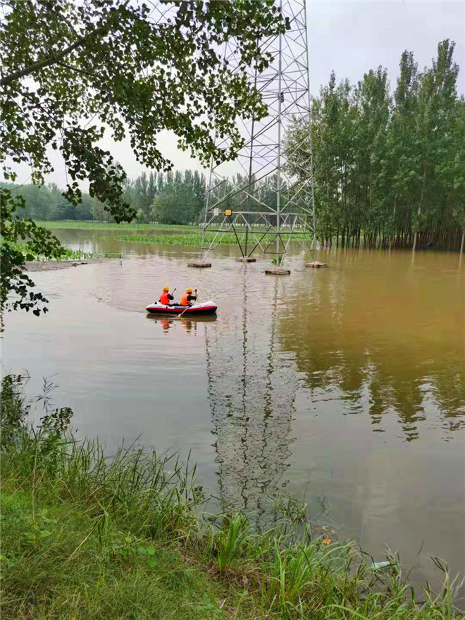 為了確保周口主網(wǎng)高壓線路安全穩(wěn)定運行,連日來,“小毛”毛學用和他的同事克服困難劃著皮劃艇,人工近距離檢查桿塔基礎泡水情況。