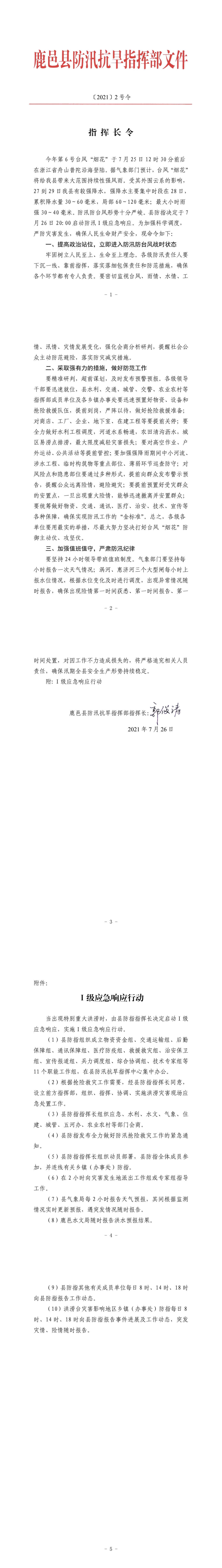 附件:Ⅰ級(jí)應(yīng)急響應(yīng)行動(dòng)當(dāng)出現(xiàn)特別重大洪澇時(shí),由縣防指指揮長(zhǎng)決定啟動(dòng)Ⅰ級(jí)應(yīng)急響應(yīng),實(shí)施Ⅰ級(jí)應(yīng)急響應(yīng)行動(dòng)。