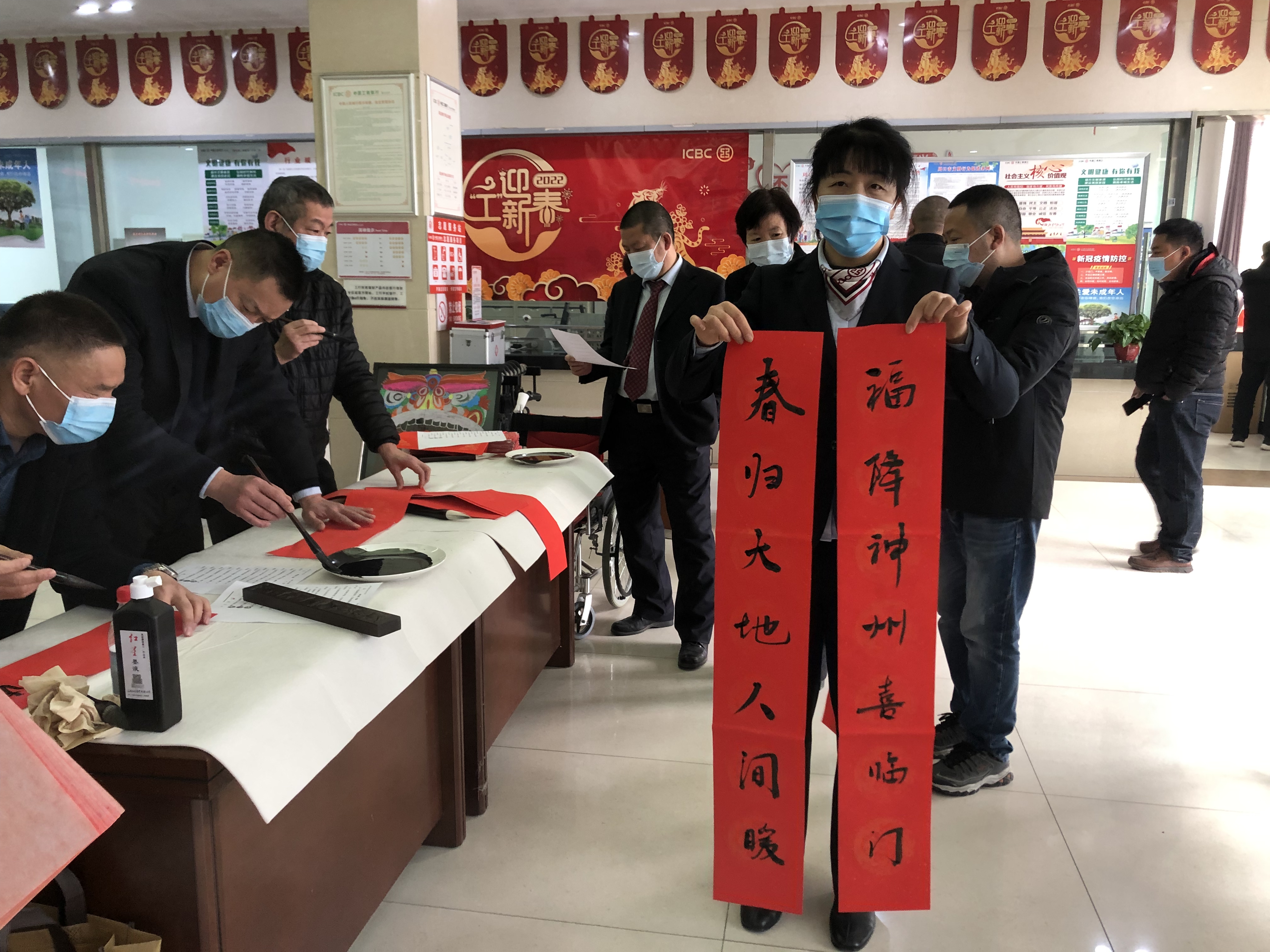 春節(jié)臨近,工行周口分行開展“寫春聯(lián)送福字”活動(dòng),精心組織本行書法協(xié)會會員分赴基層網(wǎng)點(diǎn),在營業(yè)廳堂揮毫潑墨,為客戶寫春聯(lián)、送福字。把一幅幅盛贊祖國昌盛、人民安居樂業(yè)、新春祝福送給客戶。此次活動(dòng),該行共計(jì)為客戶送出春聯(lián)1300余幅,受到廣大客戶的稱贊。 李玉 攝①2