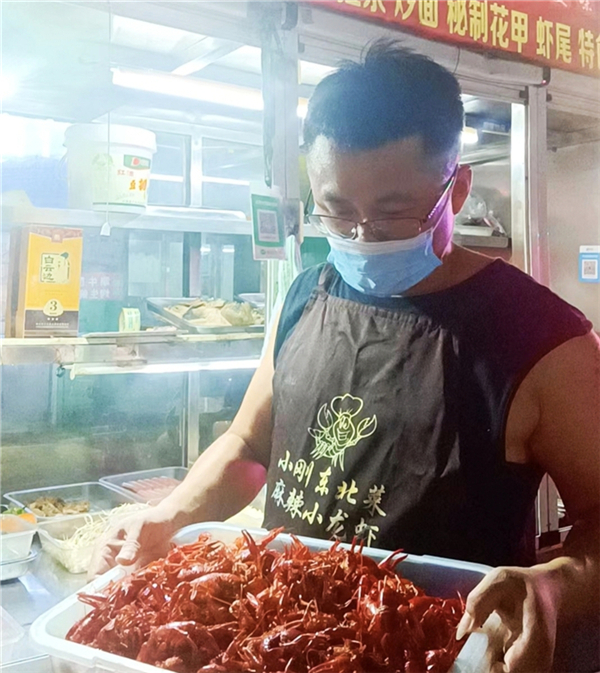 此時,在“東北小剛”麻辣小龍蝦夜攤前,已經(jīng)擺放好了幾張桌子,三五成群的客人相繼前來落座??腿它c餐后,只見攤主“小剛”就站在操作臺前,手腳麻利地將提前準備好的小龍蝦等菜品一一裝盤,然后送到客人面前,忙得不可開交。