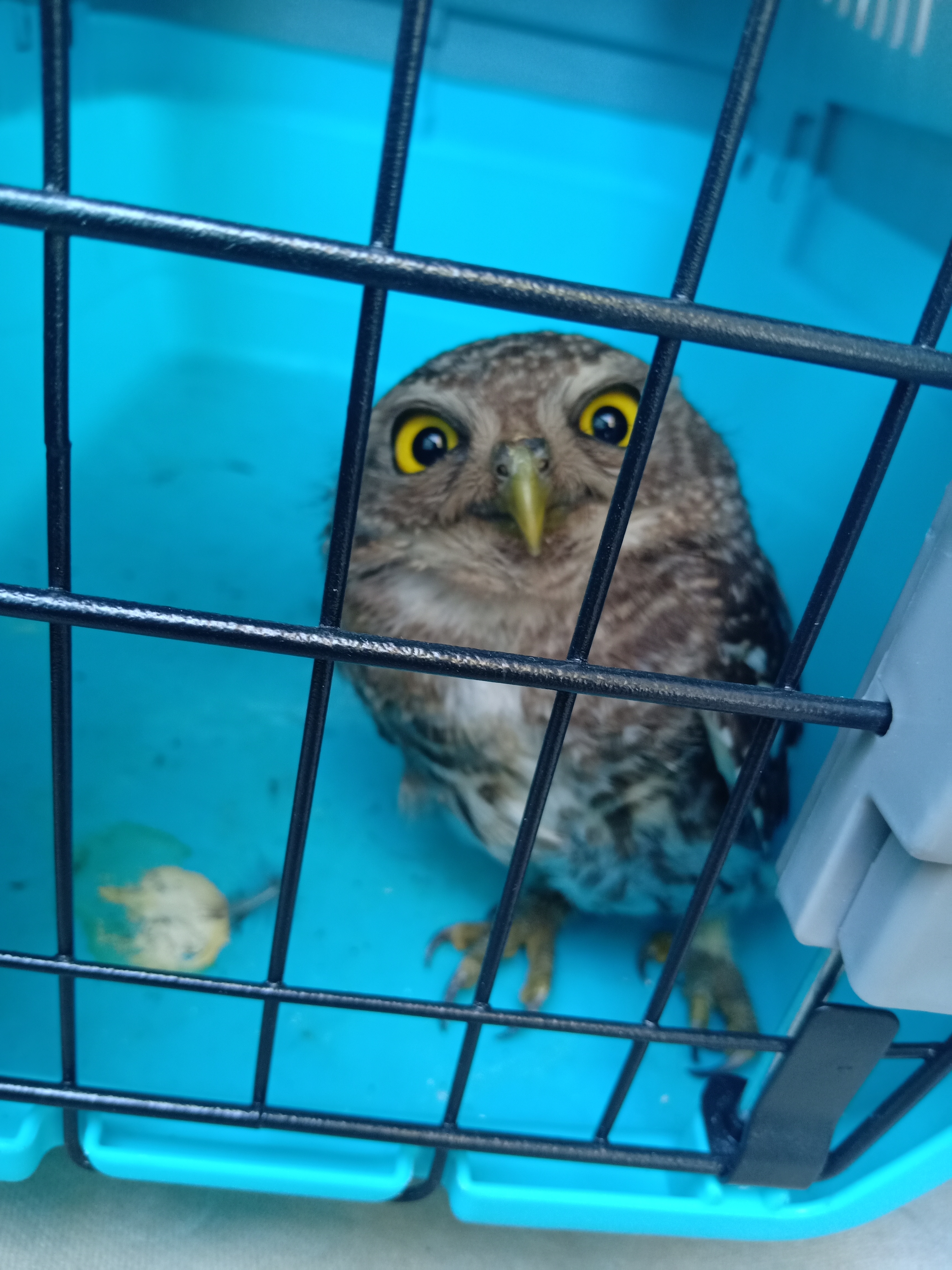 當(dāng)天,張向忠和張金華兩人從周口趕回項(xiàng)城完善相關(guān)救助資料后,突然接到項(xiàng)城市公安局森林警察大隊(duì)的來(lái)電,被告知賈嶺鎮(zhèn)派出所剛剛收到群眾撿到的一只斑頭鵂鹠,疑似中暑落地飛不起來(lái),需要前往救助。