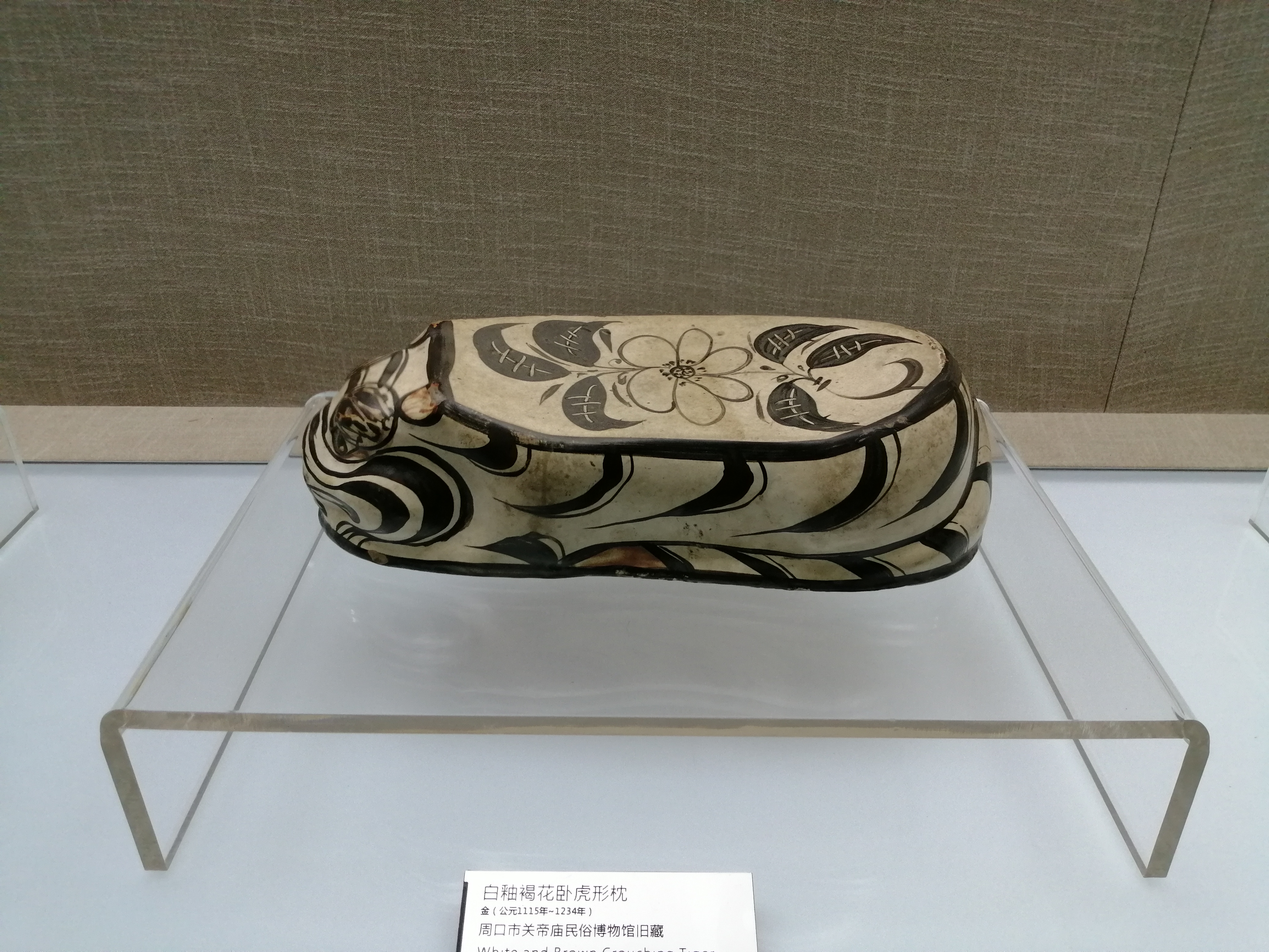 據(jù)市博物館工作人員介紹,這件館藏金代磁州窯白釉褐花臥虎枕是1978年7月商水縣練集鄉(xiāng)農(nóng)民在翻土?xí)r發(fā)現(xiàn)的。長34厘米,寬14厘米,高10厘米。枕體呈臥虎狀,枕面為腰圓形,前高后低,大平底。整器以虎身為枕身,以黑彩繪出虎頭形象和虎身?xiàng)l狀斑紋,虎鼻為兩氣孔。以虎背作枕面,其上以黑彩繪折枝花卉,枝葉上飾“豐”字紋葉脈,花朵勾勒流暢,花蕊清晰可見。此枕將虎的溫馴的狀態(tài)及折枝花卉和諧地組合在一起,形象生動活潑,情趣盎然,體現(xiàn)了工匠豐富的想象力。據(jù)說枕以虎等猛獸為造型,可鎮(zhèn)妖避邪、早得貴子。