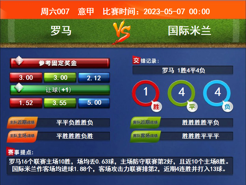 比賽時間:2023-05-07 00:00賽事提點:羅馬16個聯(lián)賽主場10勝,場均丟0.63球,主場防守聯(lián)賽第2好,且近10個主場8勝。國際米蘭作客場均進(jìn)球1.88個,客場攻擊力聯(lián)賽排第2,近期4連勝并打入13球。