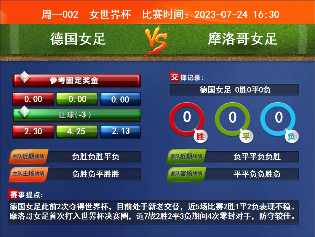 比賽時間:2023-07-24 16:30賽事提點:德國女足此前2次奪得世界杯,目前處于新老交替,近5場比賽2勝1平2負(fù)表現(xiàn)不穩(wěn)。摩洛哥女足首次打入世界杯決賽圈,近7戰(zhàn)2勝2平3負(fù)期間4次零封對手,防守較佳。